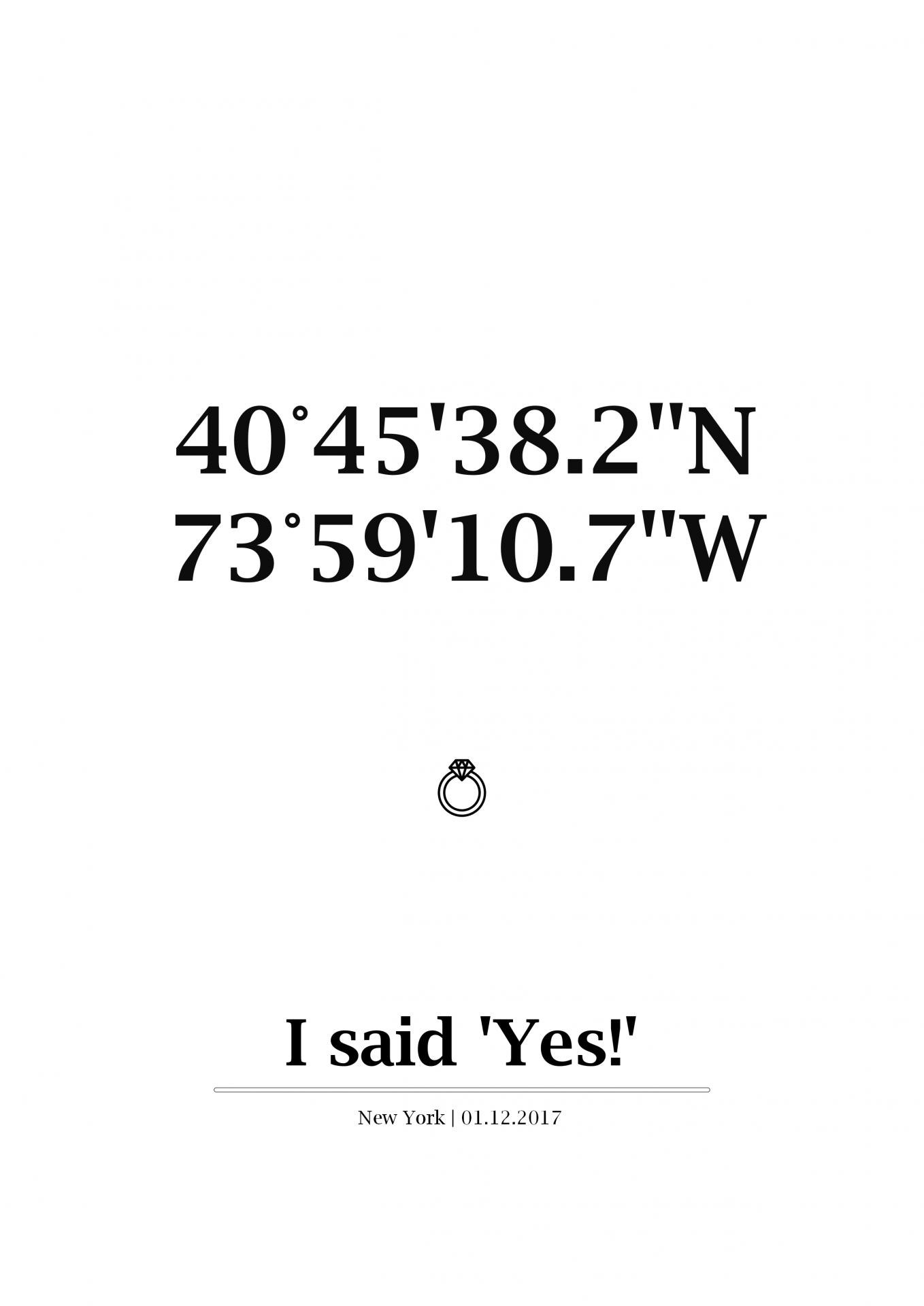 Exemplo: "Pretendo um mapa com as coodenadas de Times Square em Nova Iorque, com o simbolo de um "Anel de Noivado". No título pretendo "I said "YES"" e no subtítulo: "New York | 01.12.2017". Pretendo sem "border no mapa".