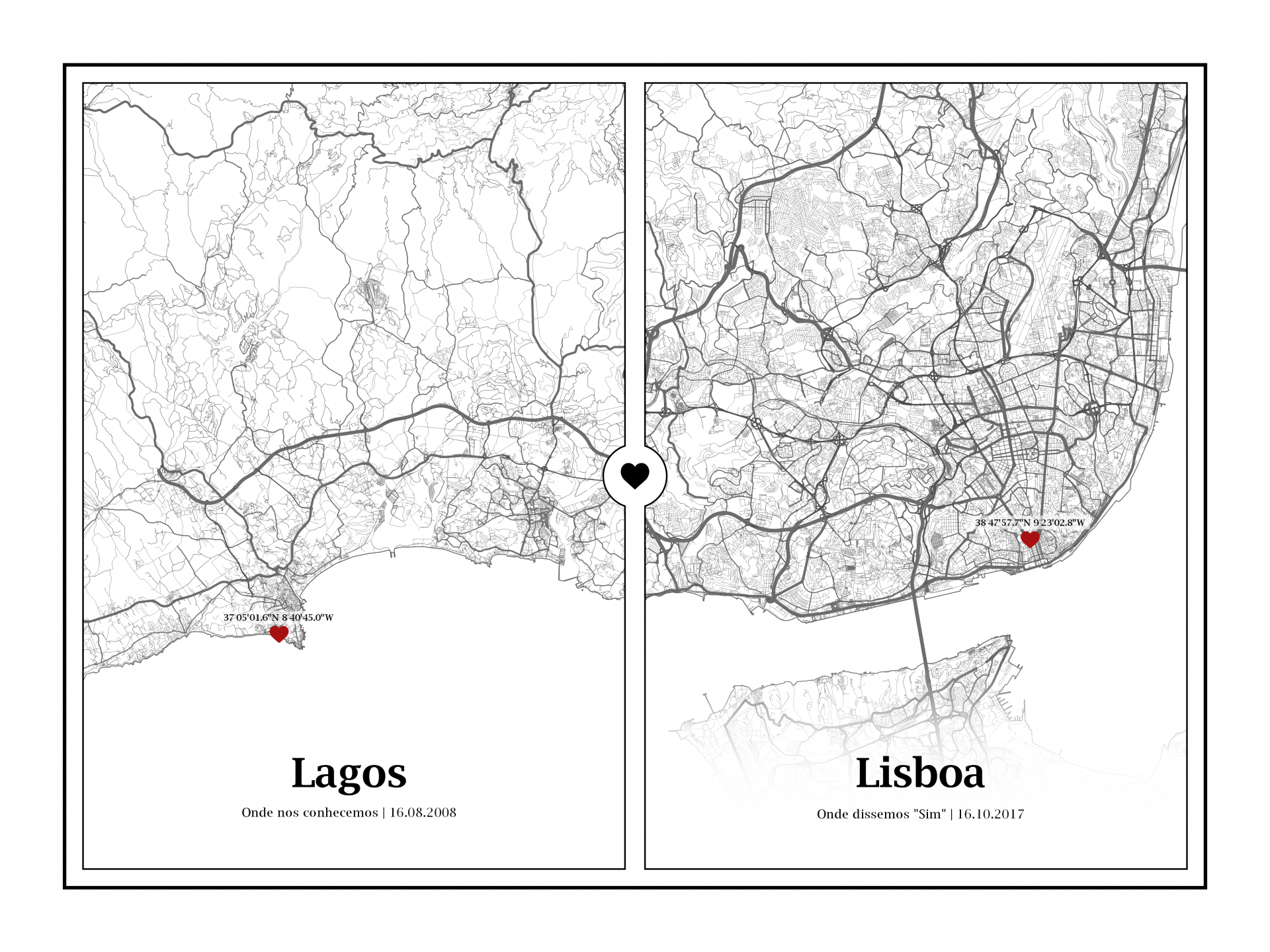 - Exemplo : "Pretendo no mapa 1 com os nomes Joana e Pedro, no título: "Lar doce lar" e no subtítulo: "10.05.2008". A morada a localizar no mapa com um coração é: Avenida da República, nº1 Lisboa e no mapa 2 apenas com as coordenadas no ponto "Rua ABC nº1 Coimbra" e no ponto "Rua BCD nº244, Coimbra. O simbolo a localizar são corações"