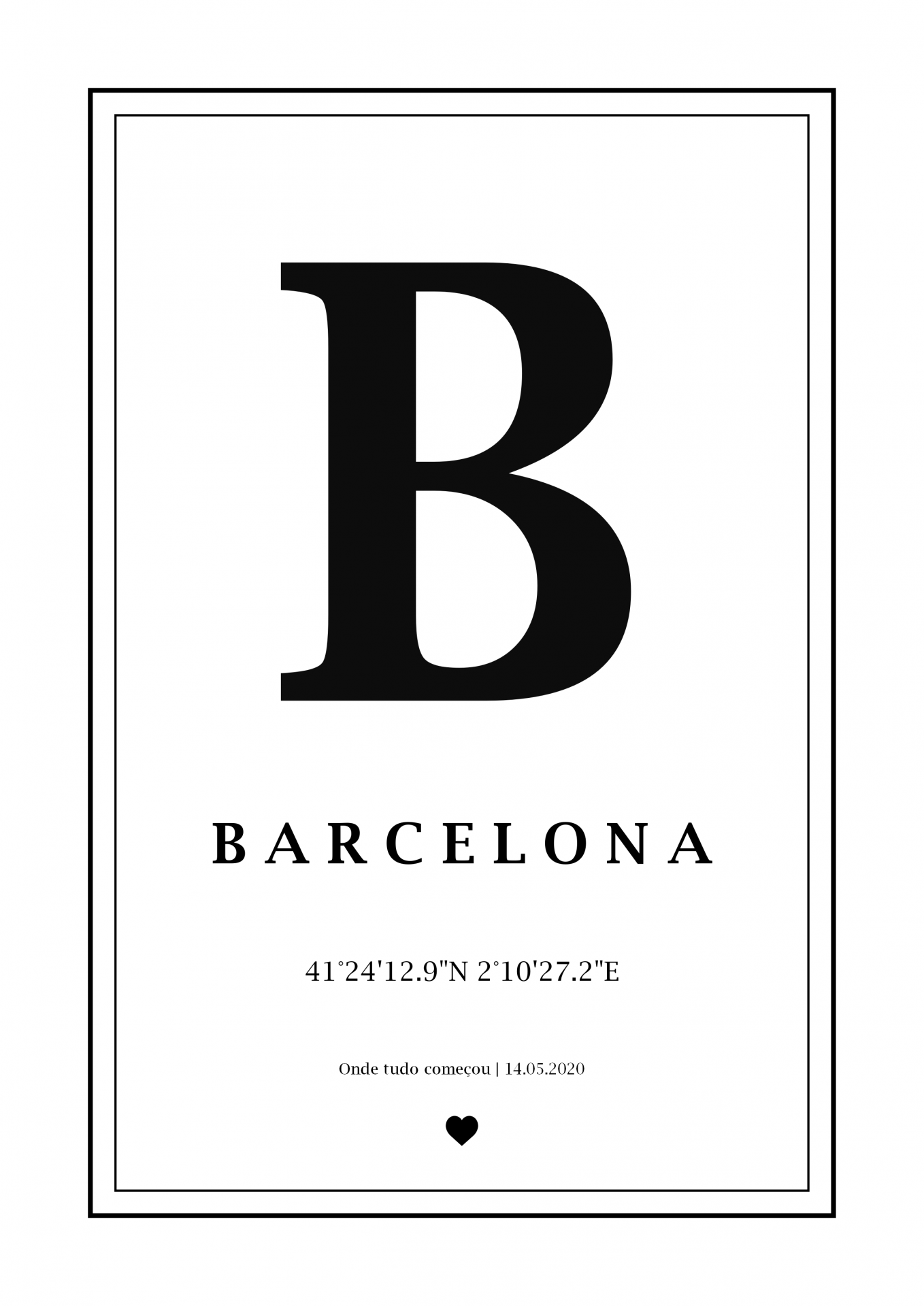 Exemplo: Pretendo um mapa com as coodenadas da Sagrada Família em Barcelona, com o no nome da cidade "Barcelona", com as coordendas do local e com a frase e data "Onde tudo começou | 14.05.2020". Pretendo ainda o simbolo de um "coração" no final